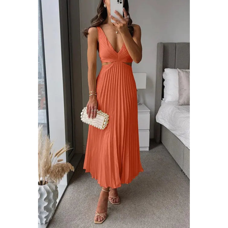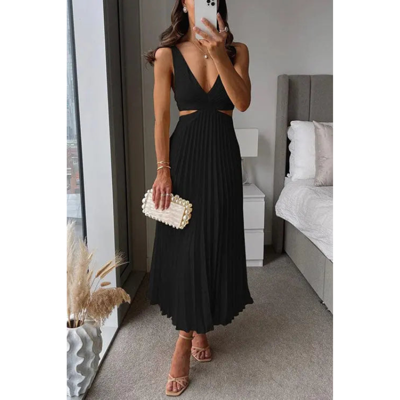 This sleeveless pleated maxi dress features a deep V-neck and cut-out sides, offering an elegant, flattering silhouette perfect for parties, vacations, or evenings out.