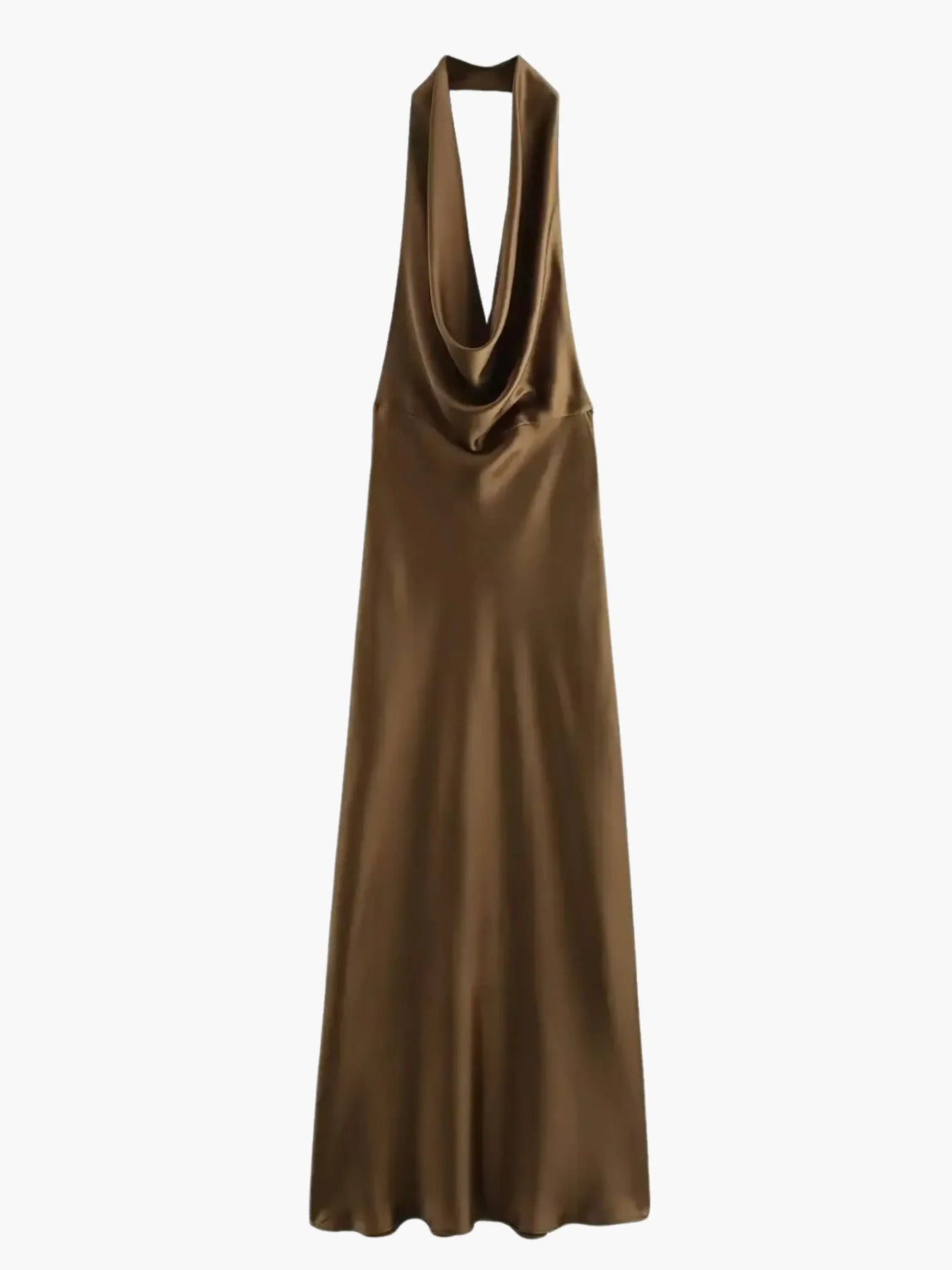 This elegant maxi dress features a graceful cowl neckline and flowing silhouette, combining timeless sophistication with modern appeal — perfect for any evening occasion.