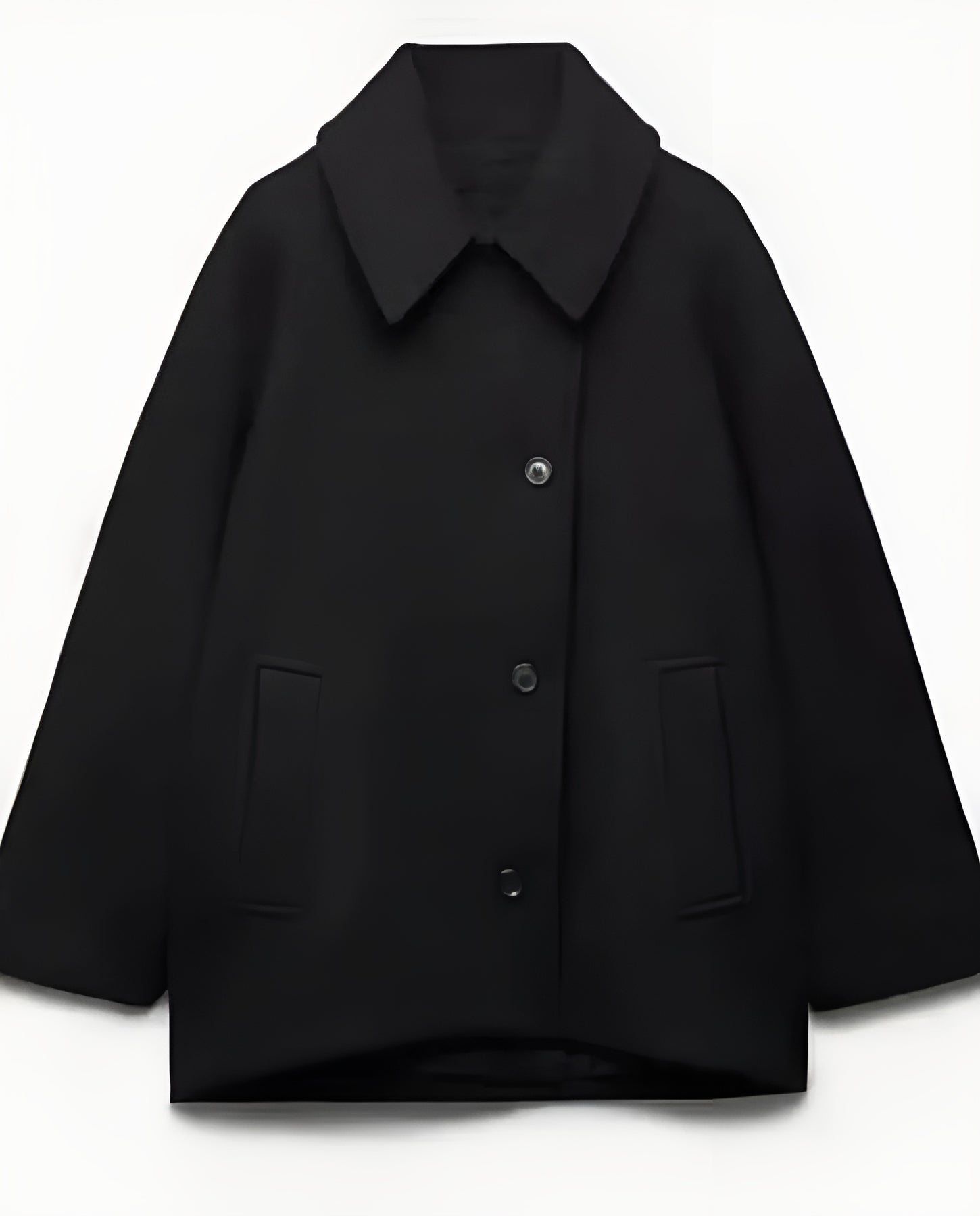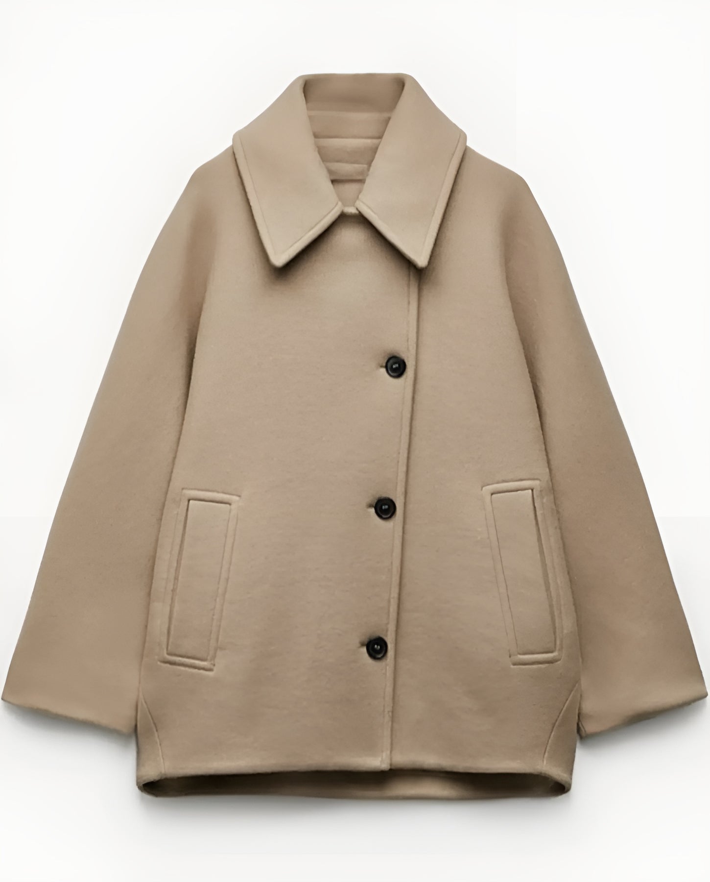 Stylish short coat for women with a relaxed fit and lapel collar — perfect for layering over knitwear and dresses for an effortlessly chic winter look.