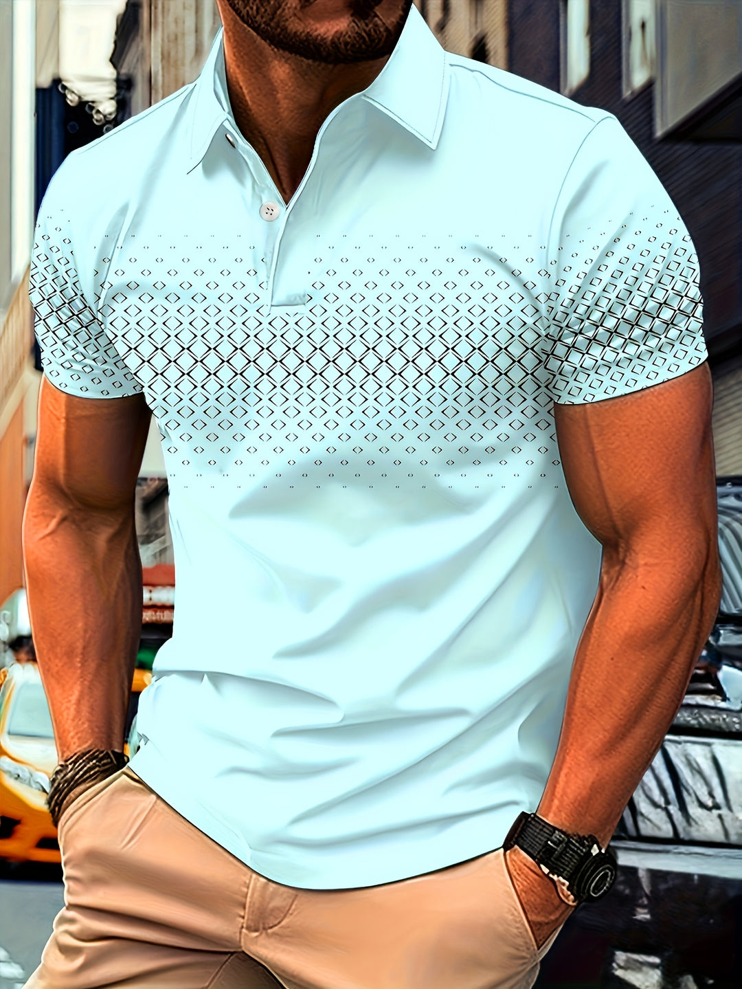 This stylish men's polo with a black diamond print combines comfort and elegance. Made from soft stretch fabric, ideal for casual and summer outfits.