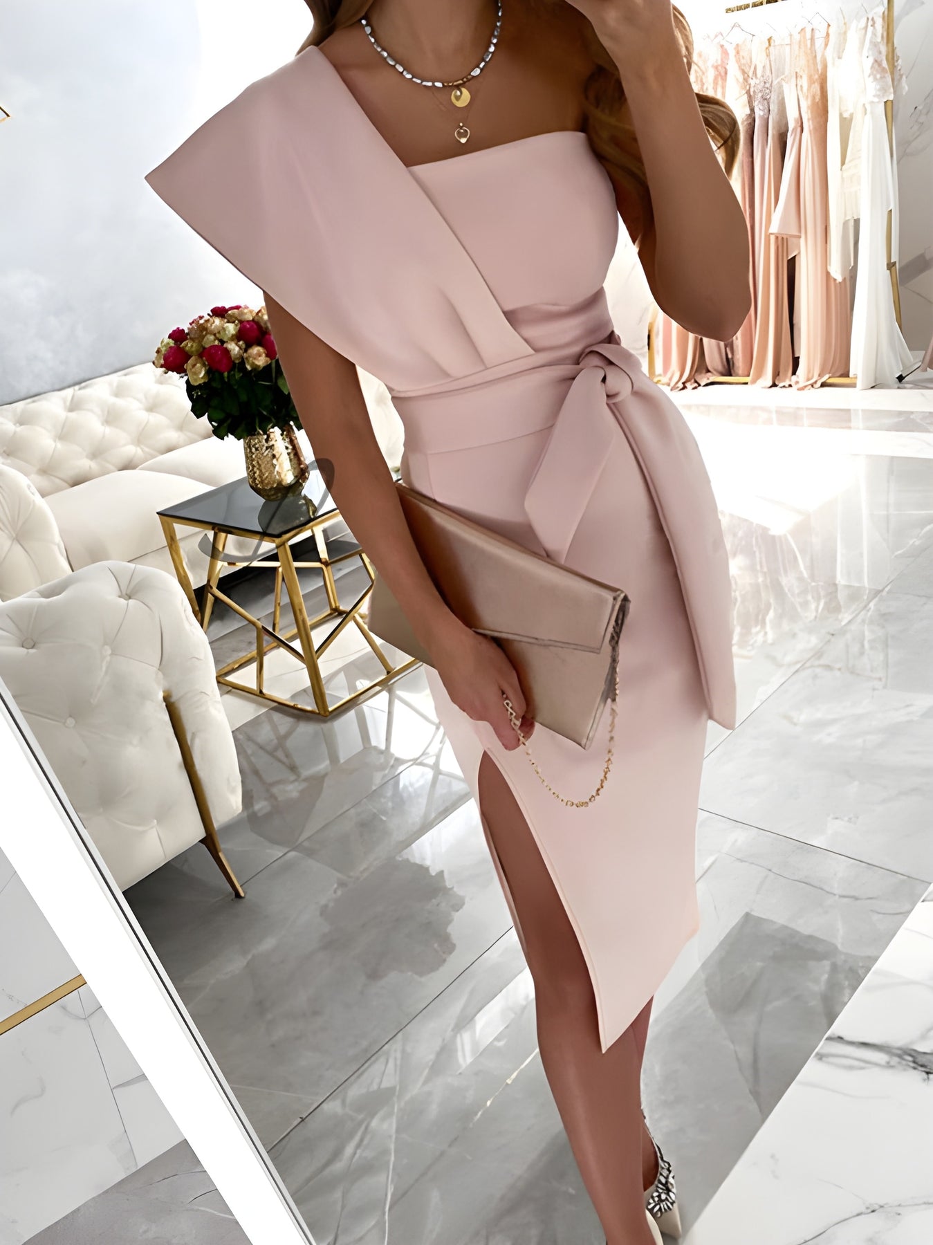 Make a striking entrance with this elegant one-shoulder wrap dress. Featuring a sleek pencil silhouette and lace-up detail, this sleeveless dress is perfect for evening parties, cocktails, or formal events.