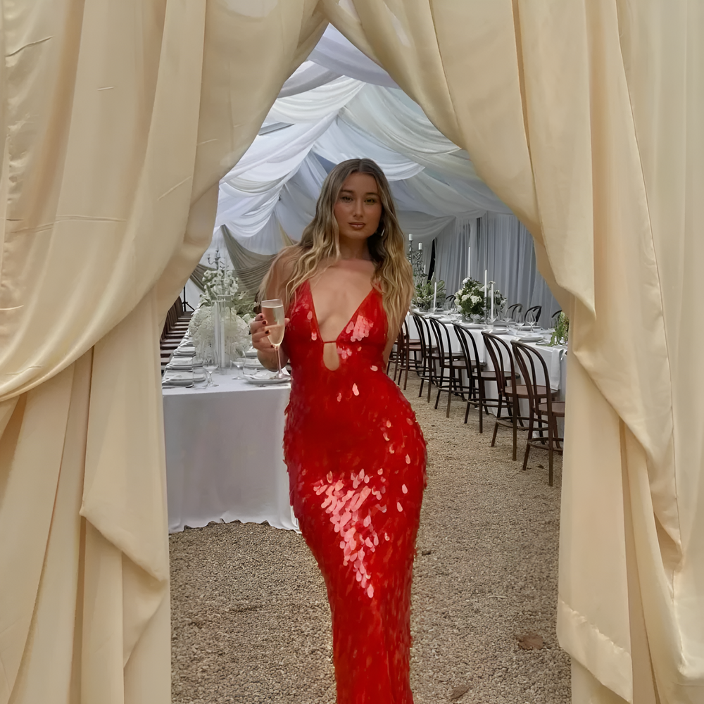 Dam Maxi Dress | Sequin Dress with Spaghetti Straps | Figure-Hugging & Backless | Party & Wedding